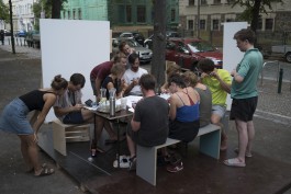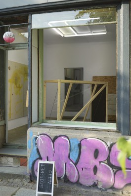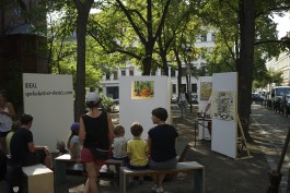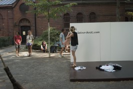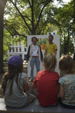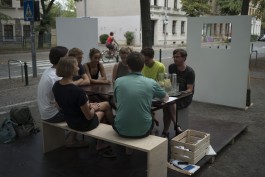 Jacob Ott (Freiburg) and Johannes Willi (Basel) take over and occupy the IDEAL artspace and Neustädter Markt with a promotional stand for „speculative property“. The setting serves as a stage and communication platform for experimental formats which analyse the threshold of private and common property with visitors and neighbours. How can common ground be extended in a speculative way?