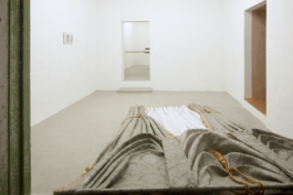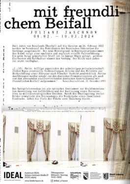 The starting point of the exhibition "with friendly applause" is the continuity of Russia's propagandistic staging before and after the invasion of Ukraine. The narratives characterized by militarism and nationalism - masked as harmless stage sets of a grotesque re-enactment of historical (pre)images - are confronted with the reality of war today. In the exhibition, Juliane Jaschnow shifts the perspective to individual fragments of Russia's media productions and examines the mechanisms of disinformation and deception. "with friendly applause" follows on from the exhibition "REKAPITULIEREN", which was shown in the same rooms in 2020/21.