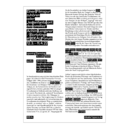 In an exploration of the French educator, writer and filmmaker Fernand Deligny (1913-1996), Achim Lengerer works with the soundtrack of Deligny's film "Ce gamin, là" for an installation in the context of IDEAL Forum. Deligny, who worked as a social worker with children and young people, founded a settlement with young adults in the south of France in 1960 to live together with children labelled "autistic" by psychiatry. Beyond pathologisation, the educator tried to enable the children to find deviant ways within (and outside) the life structure of adults, not to "educate" or "cure" them, but to create an environment and field of action for their inherent use of space and time. It was within this environment that the documentary film "Ce gamin, là" was made in 1975. The starting point for Achim Lengerer's sound work in IDEAL is the special role of the soundtrack in this film. On the one hand, Delingy uses the cinematic voix-off/voice-over as a literary narrative voice that is carefully set parallel to the cinematic image; a sound track that is "laid on" the image track and that articulates itself in fragile balance to the children's NOT speaking. On the other hand, the tones and sounds recorded on the soundtrack depict the non-linguistic habitat of the children and their relationship to living beings and things. For the project, Lengerer draws on the German translation of Deligny's Voix-off published in Scriptings#26 together with Dominique Hurth. The display of the ongoing episodic exhibition project IDEAL Forum, organised by Gregor Peschko, will be converted into a temporary sound studio for the duration of the exhibition.